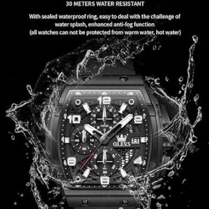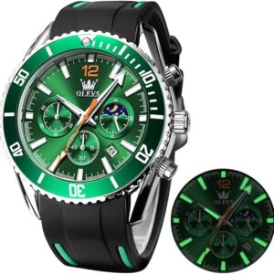 • ⌚ OLEVS Watches Chronograph : Multi-function Original Movement ,3 functional little sub-dials for chronograph minute,cPush/pull crown; Uni-directional stainless steel bezel with black top bezel ring; Functional Subdials: Moon phase dial,60min, 60sec, 24hr; Super Luminous : Luminous Hands & Calibration , is convenient to read the time in the dark(Luminous function needs to be activated by light)