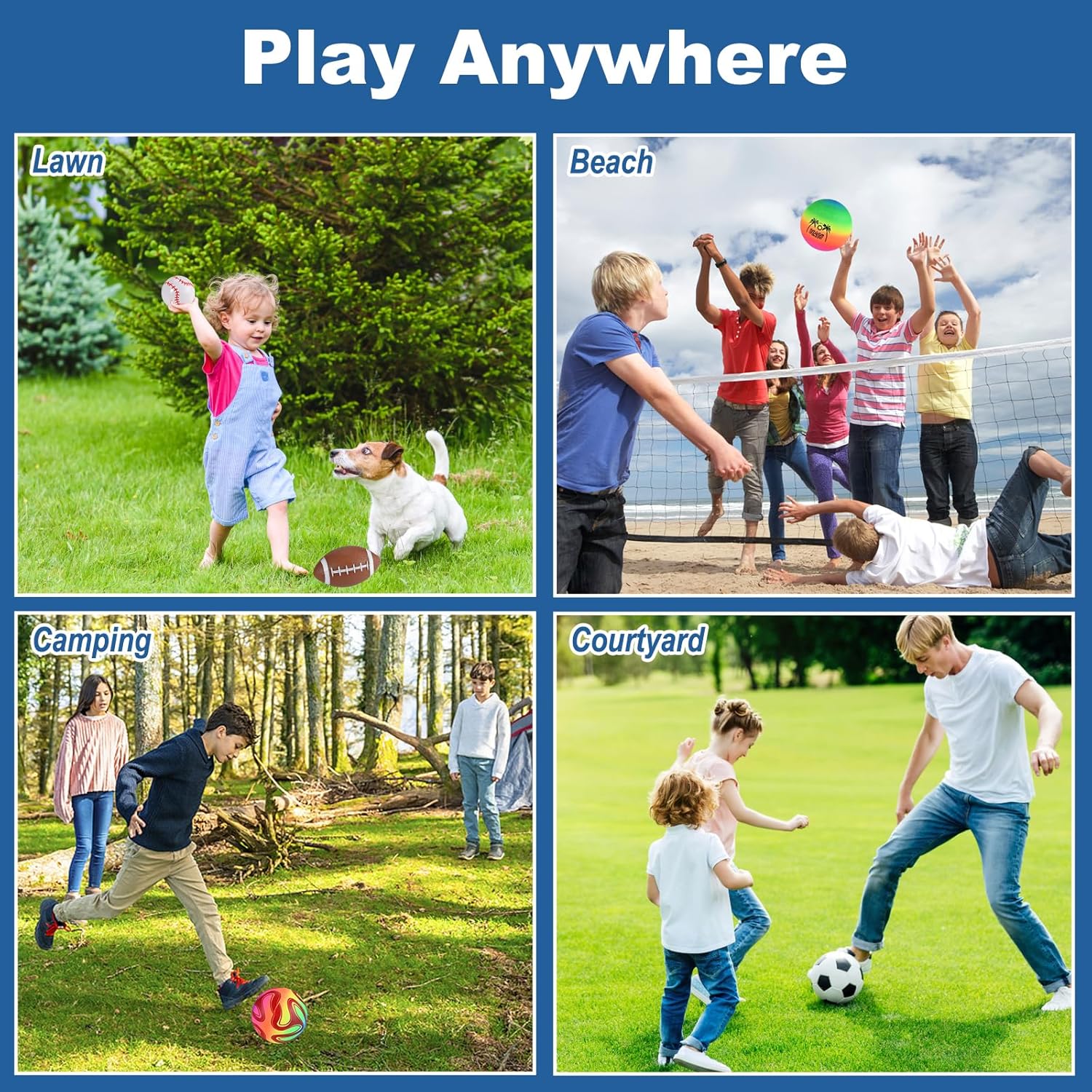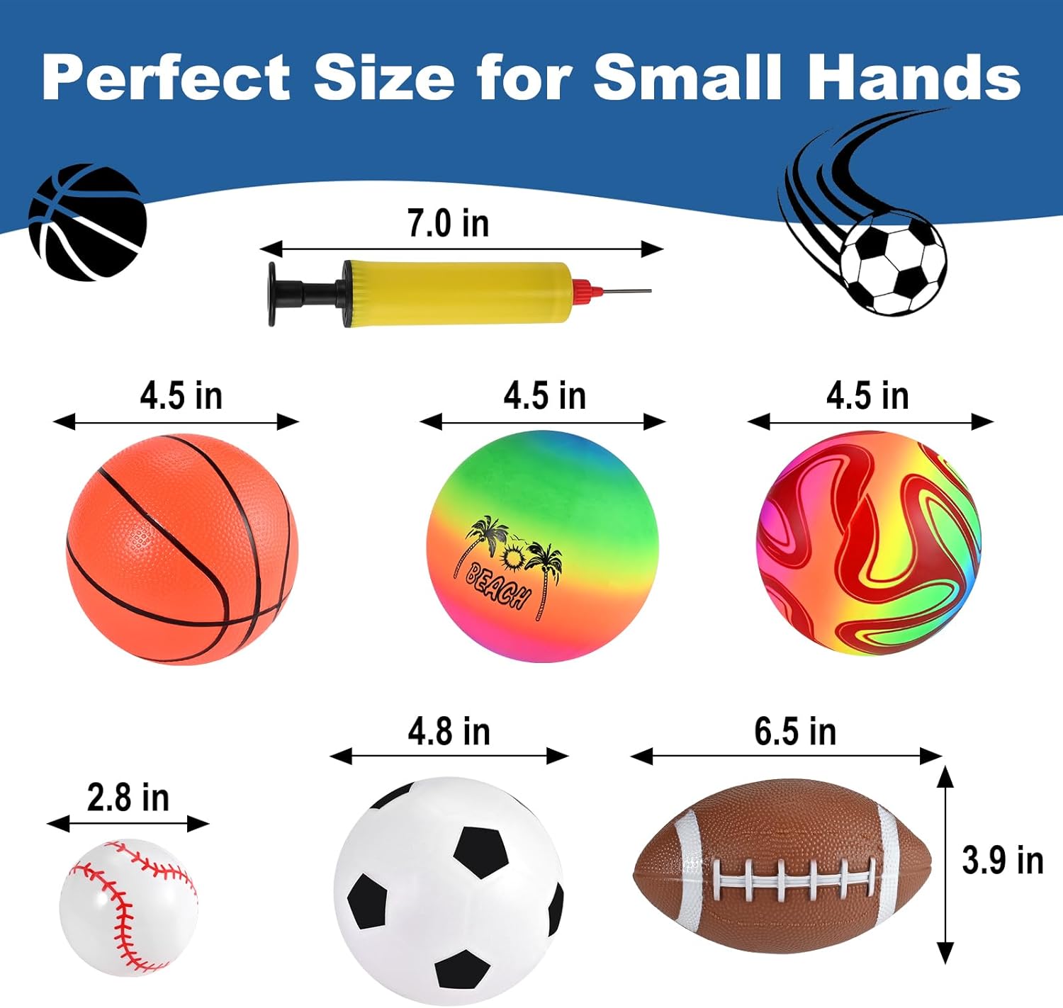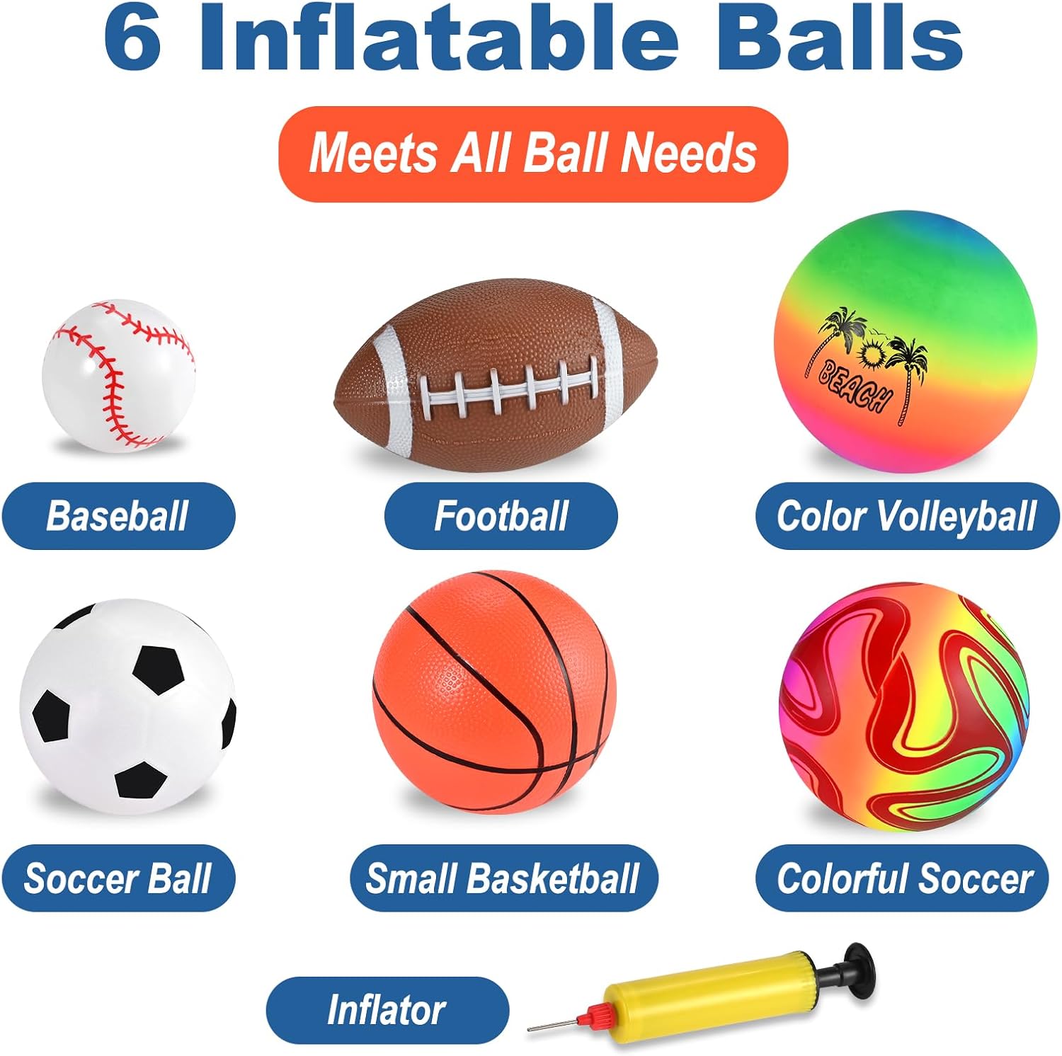 The outdoor toddler toys set includes not only children’s basketball x1, soccer x1, rugby x1, baseball x1, but also rainbow volleyball x1 and rainbow soccer x1. The playground sets for backyards includes an air pump and a storage bag. Easy to carry, no need to purchase duplicate ball toys!