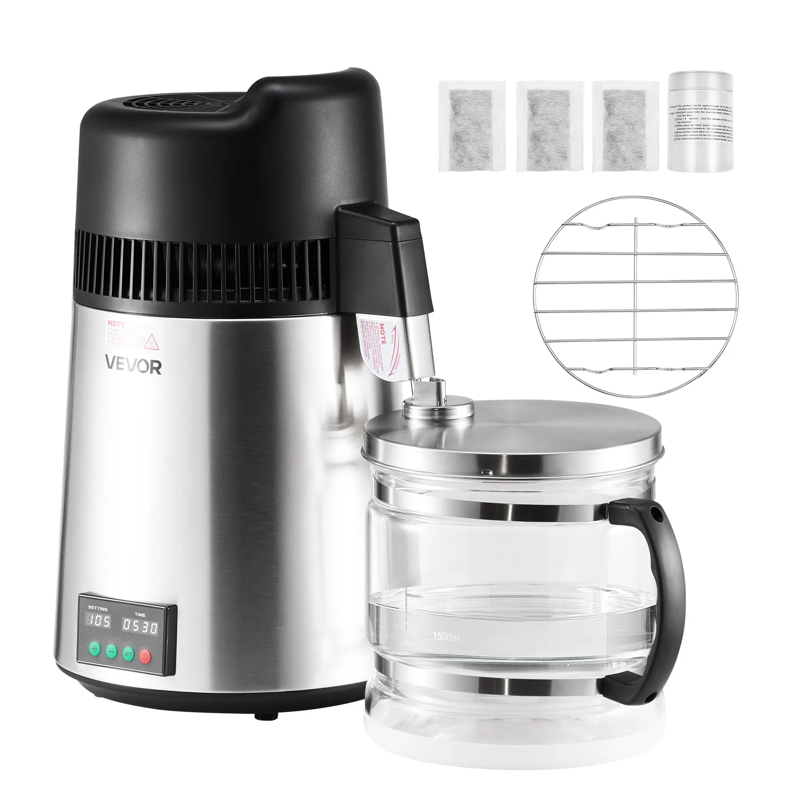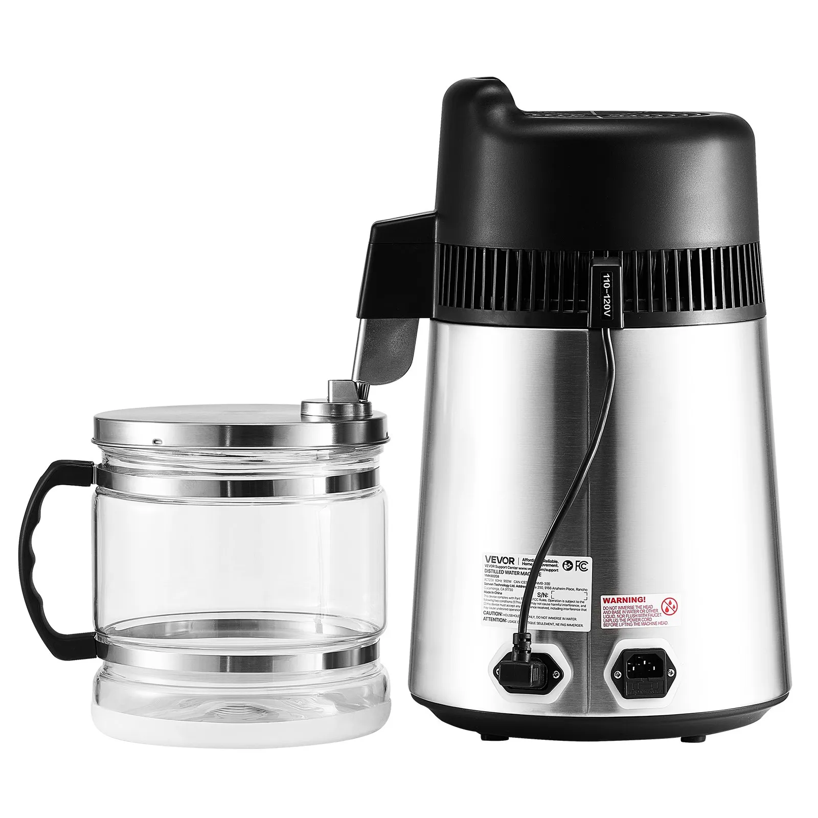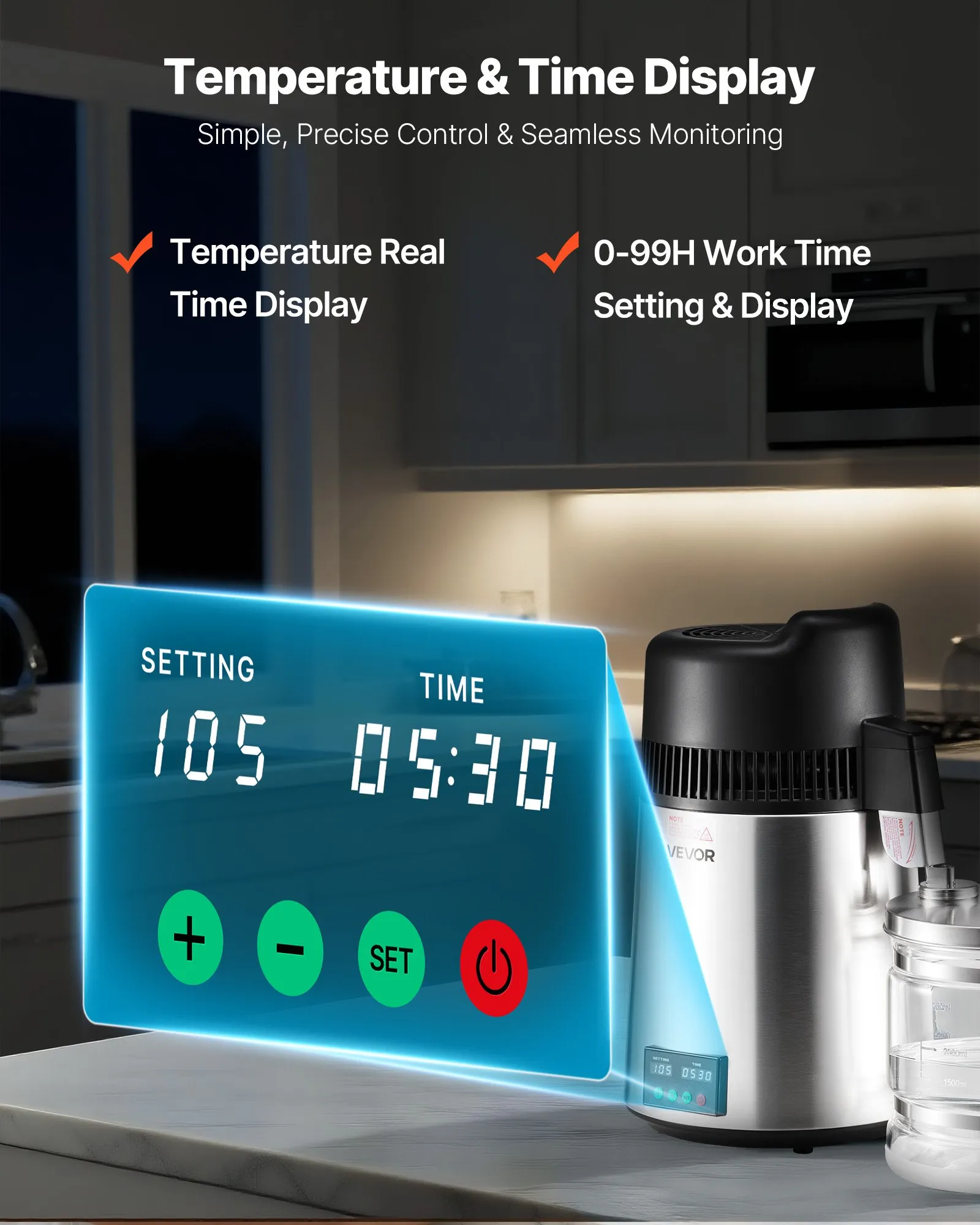 The 900W water distiller yields over 0.34GAL/1.3L of water per hour, with the capacity to distill 8.16GAL/31.2L daily.