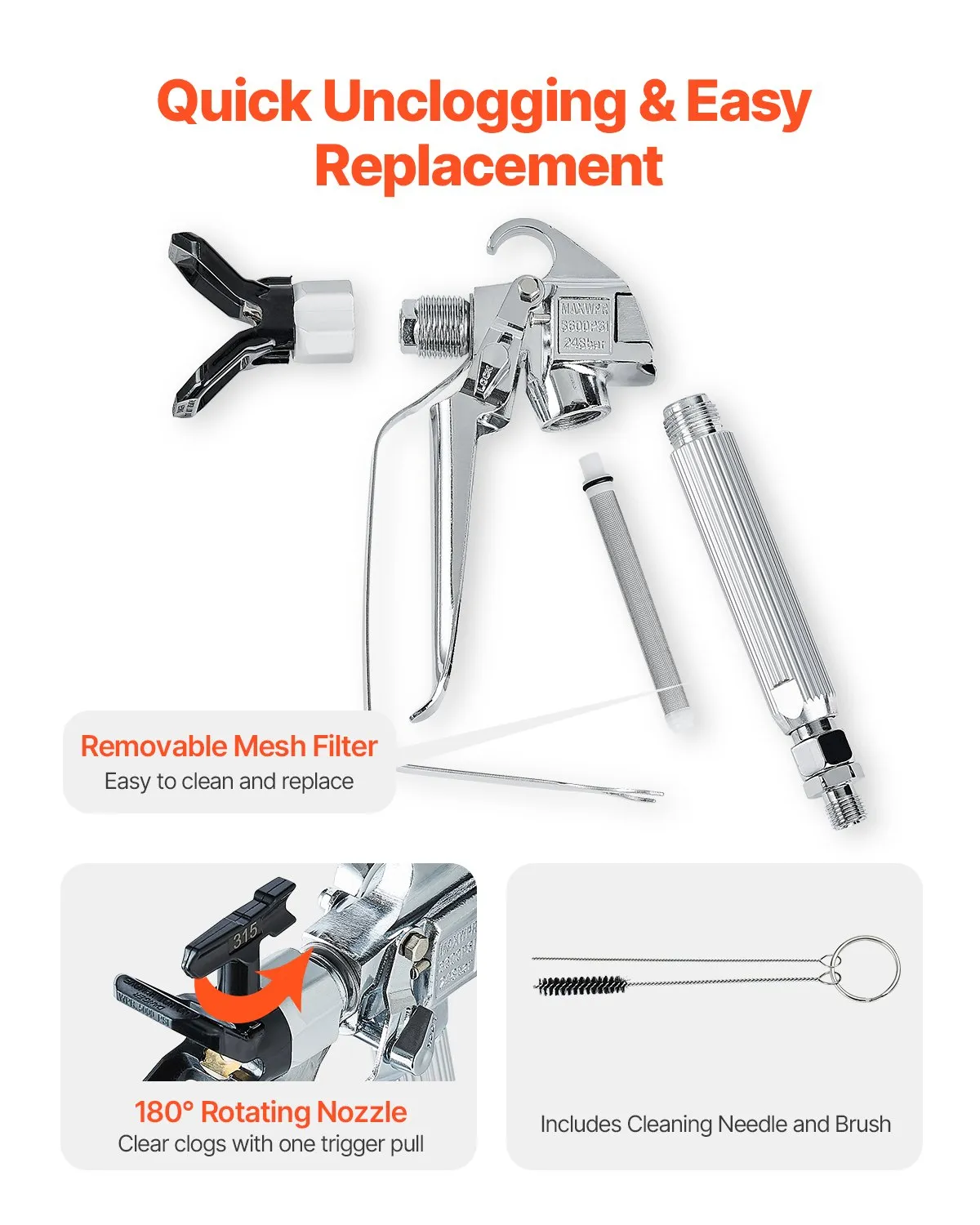 - Efficient Spraying: Our professional-grade airless paint sprayer gun with a maximum working pressure of 3600 psi ensures uniform and efficient paint application. Perfect for different spraying needs, enhancing work productivity