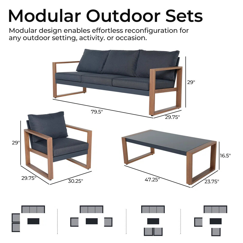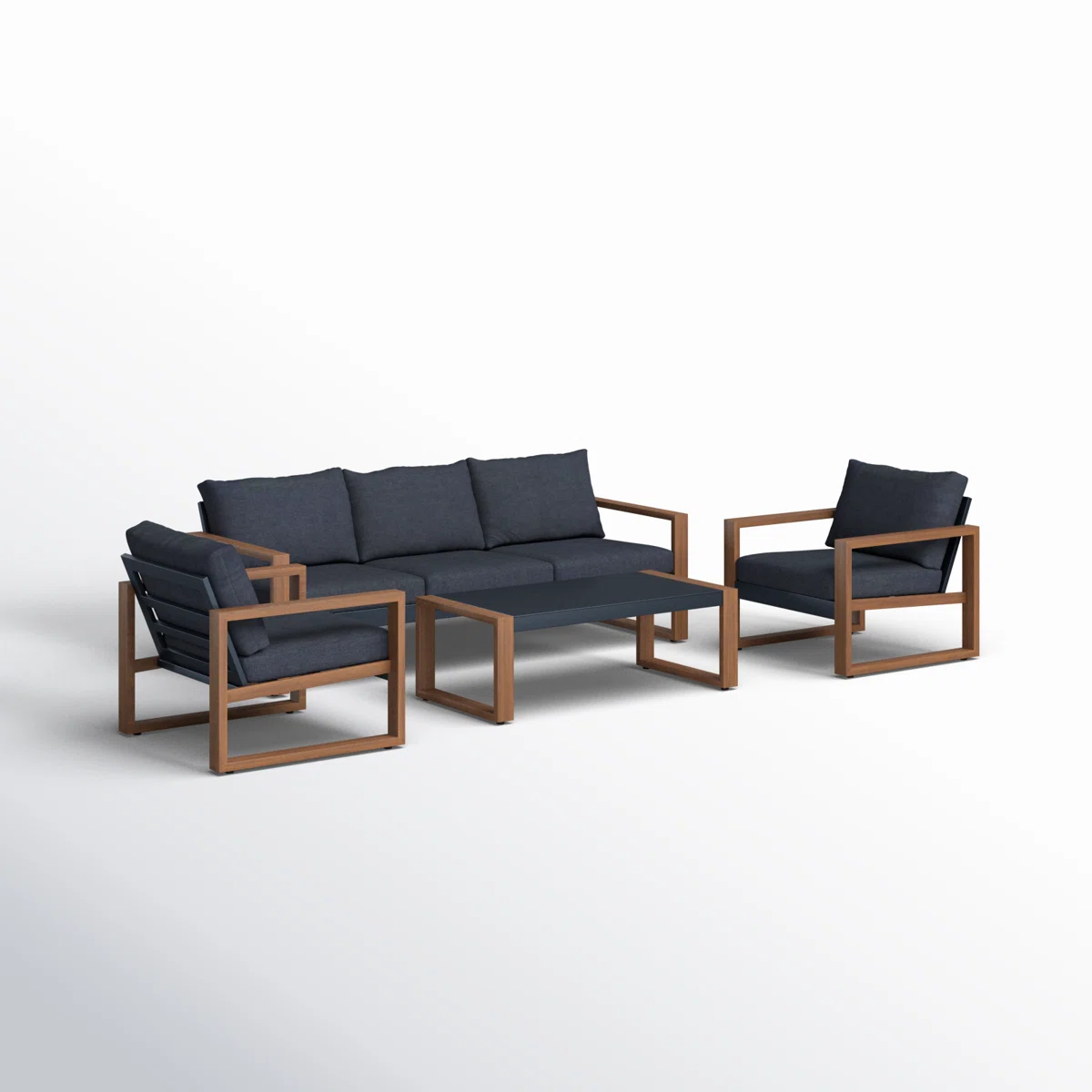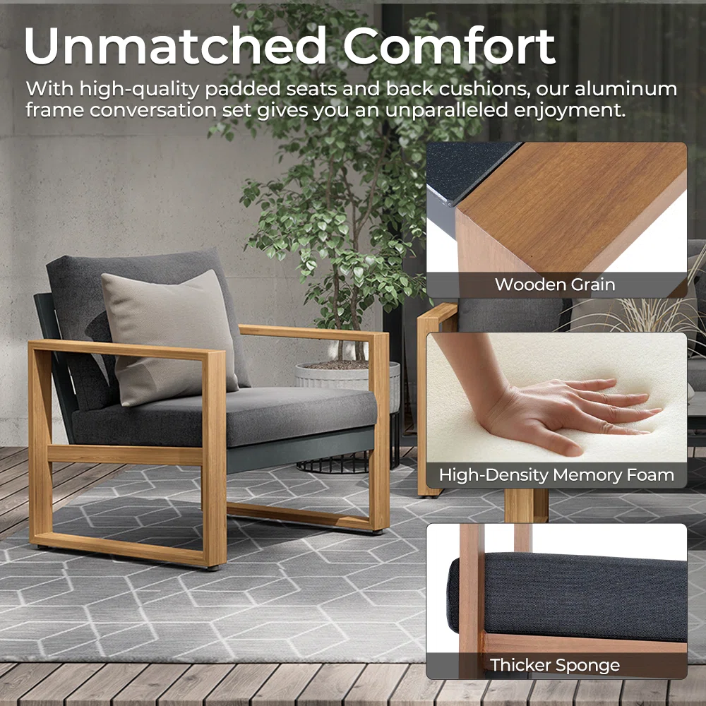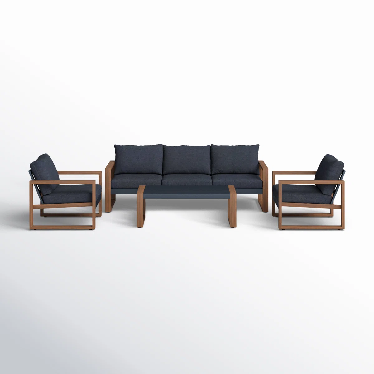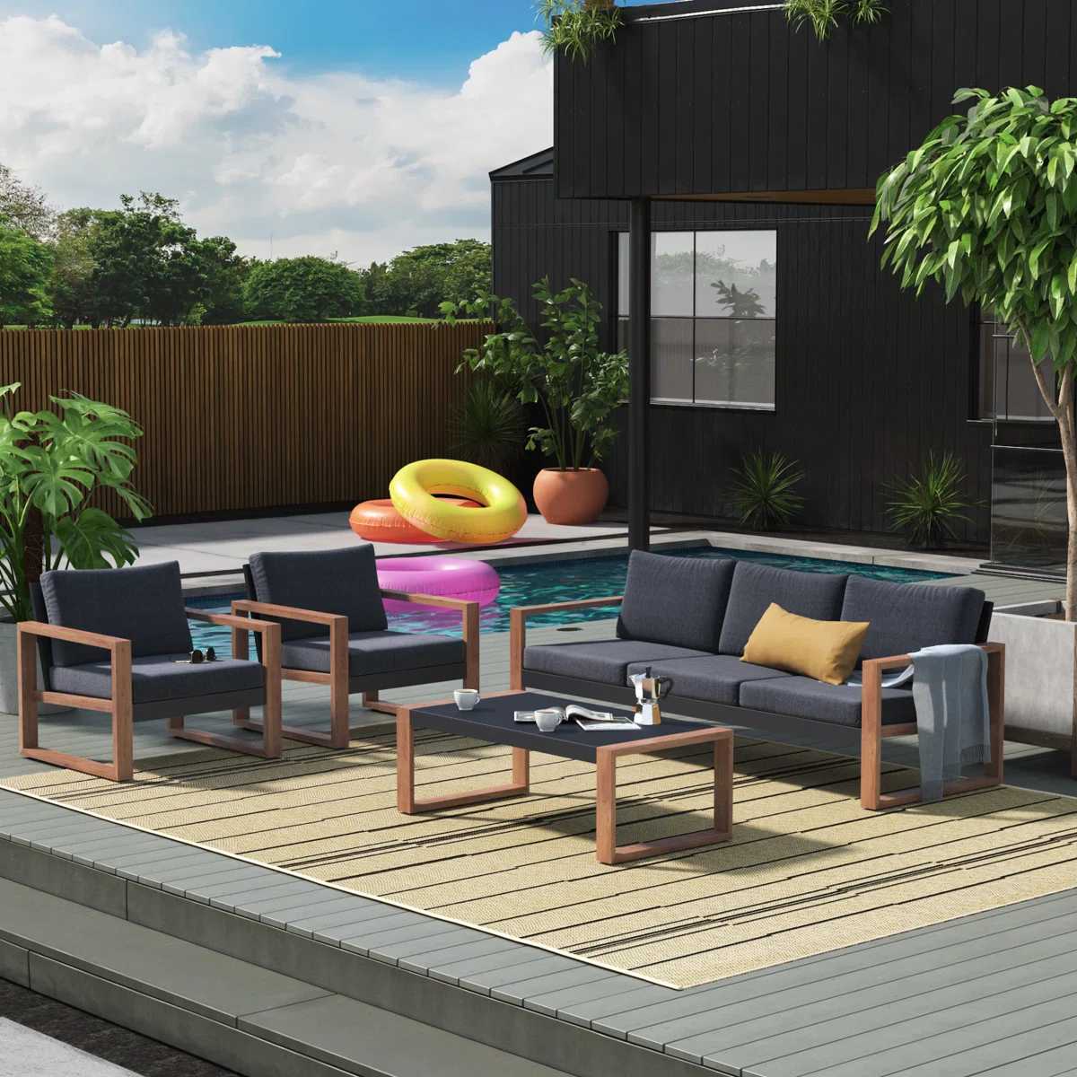 Relax in modern style with this 4-piece outdoor seating group. It includes a sofa, two chairs, a table, and cushions for up to five people. Each piece in this set is crafted with a light brown aluminum frame with UV- and weather-resistant material, so it stands up to the elements. The thick polyester-filled seat and back cushions and the deep-seated sofa provide a comfortable space for you and your guests to sit, while the included armrests offer extra support. We love that the slatted tabletop and sled legs lean into its open and minimal look. Plus, its weather-resistant zipped covers provide extra protection during harsh weather.