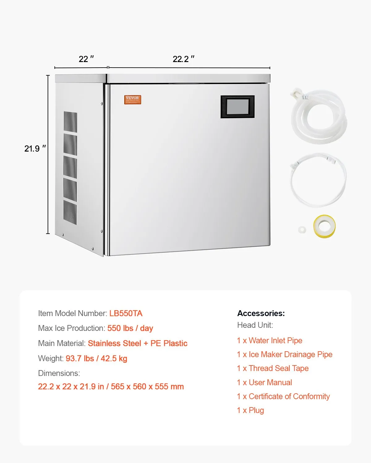 - Large Ice Production: The commercial ice maker (head) can produce 550 lbs of ice per 24 hours, which is approximately 15,000 pieces of ice, providing a continuous supply of ice in large quantities.