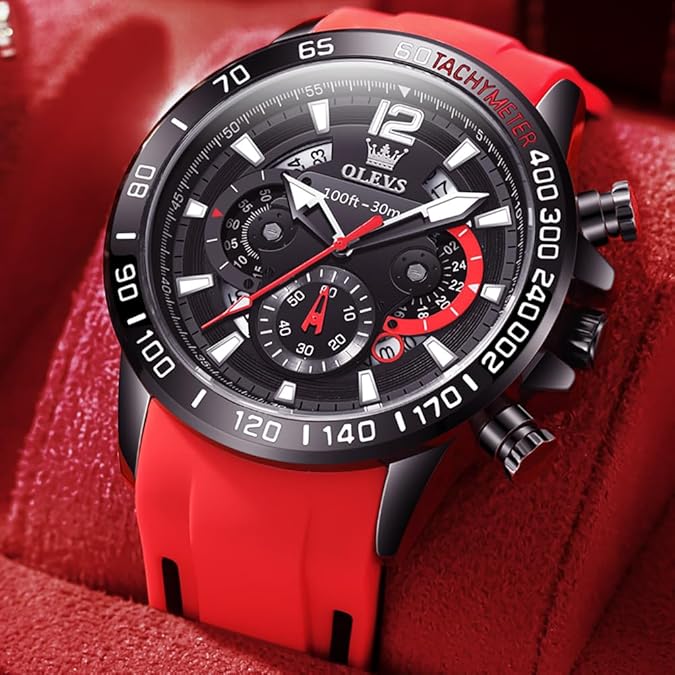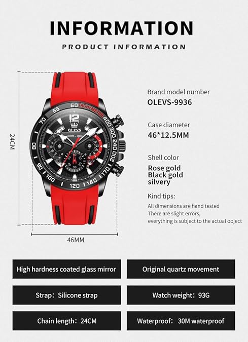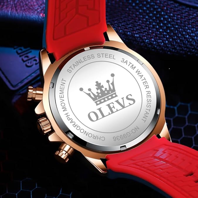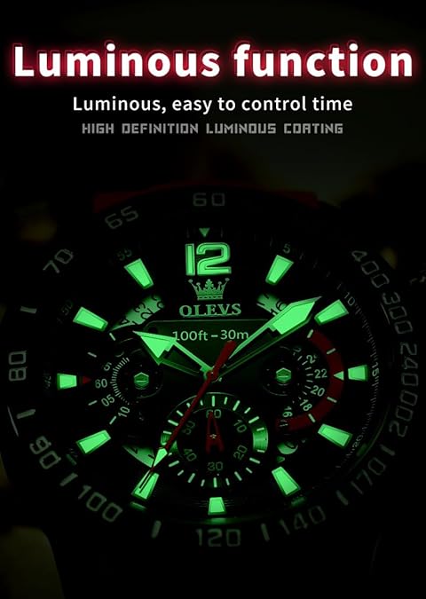 - ⌚ OLEVS Watches Chronograph : Multi-function Original Movement ,3 functional little sub-dials for chronograph minute,cPush/pull crown; Uni-directional stainless steel bezel with black top bezel ring; Functional Subdials: Moon phase dial,60min, 60sec, 24hr; Super Luminous : Luminous Hands & Calibration , is convenient to read the time in the dark(Luminous function needs to be activated by light)
