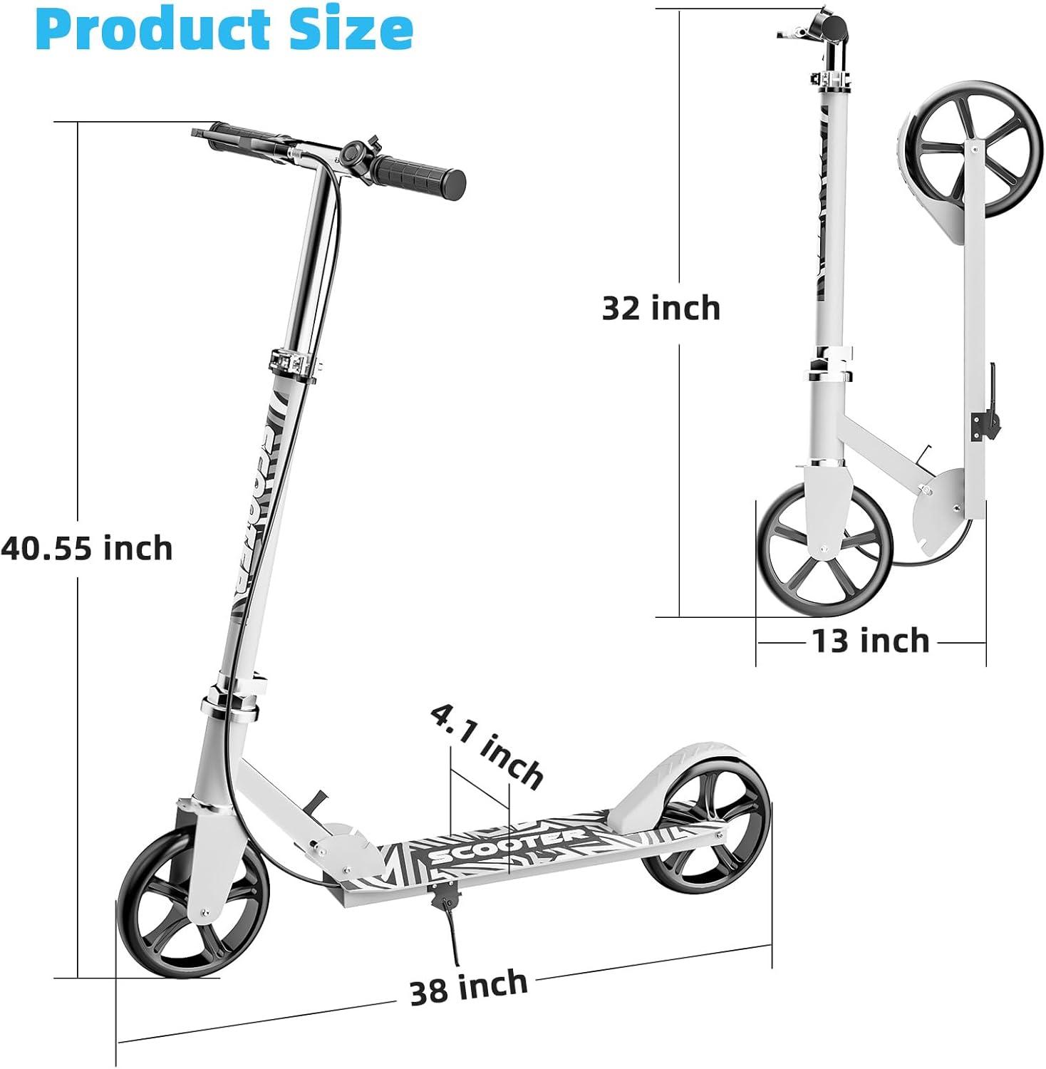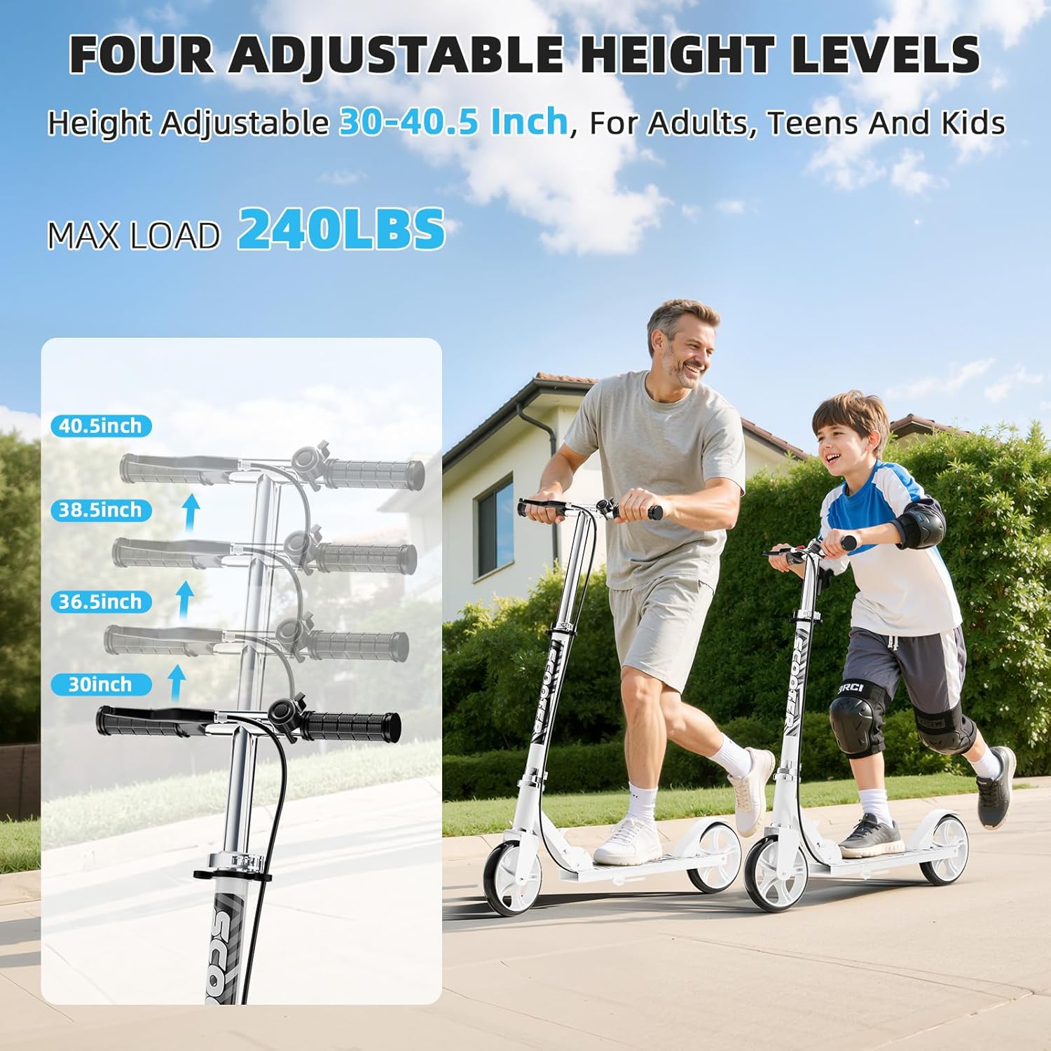 - Height Adjustable: Supports 3.9 FT – 6.6 FT height riders. The handlebar is adjustable to 4 height options (30”, 36.5”, 38.5”, 40.5”), The perfect family scooter, the same scooter can be used by parents and daughter and son riding together