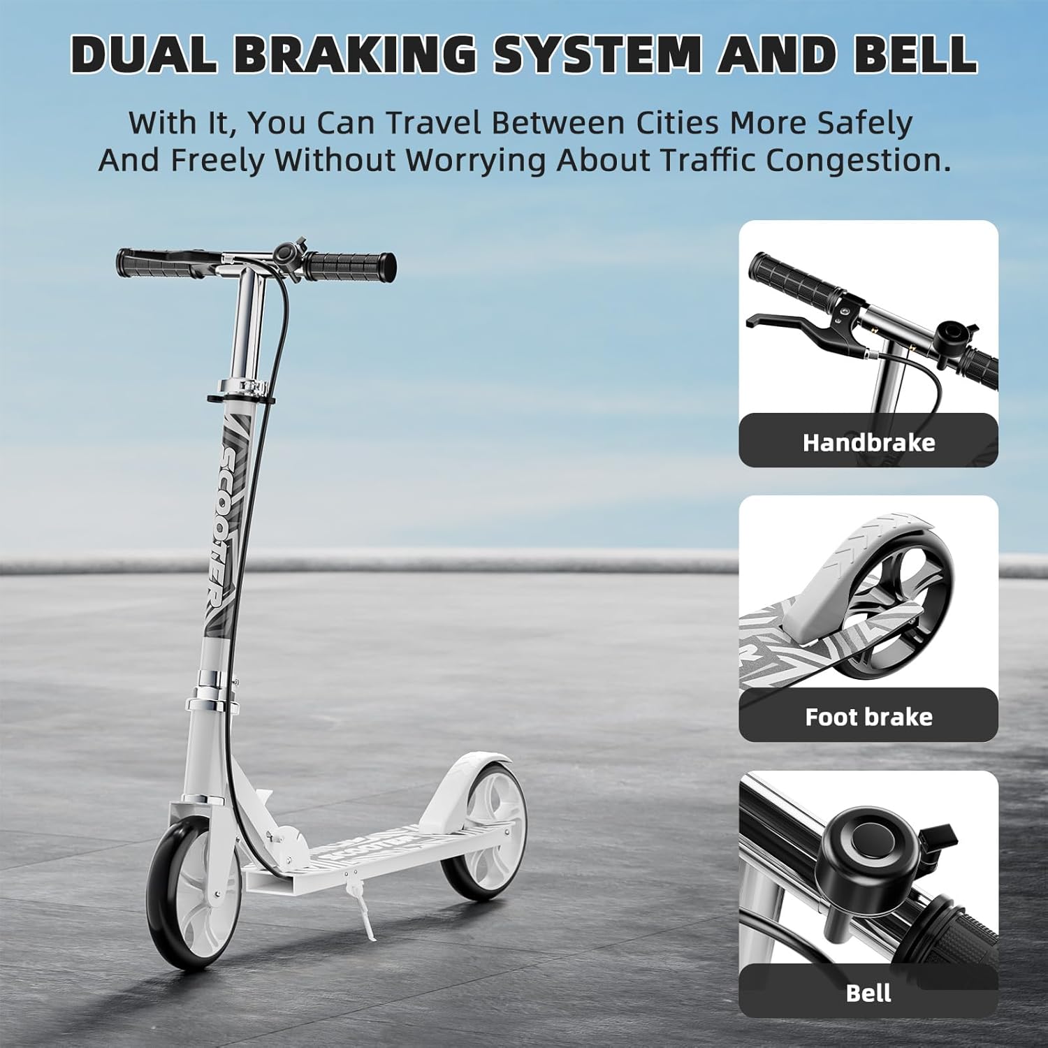 - Dual-Brake Safety System: Equipped with hand and foot brakes for enhanced control, plus a loud alert bell. Ensures reliable stopping power and visibility during rides, prioritizing safety on sidewalks or busy streets