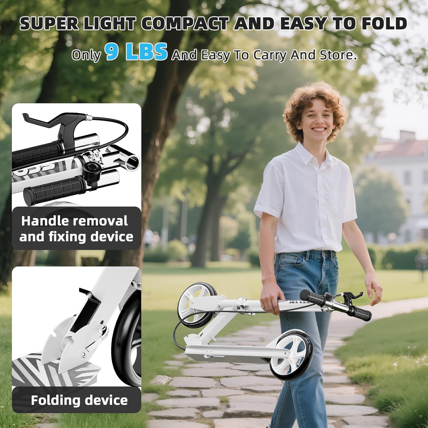 - Space-Saving & Portable Design: Quick-folding mechanism and adjustable handlebars allow compact storage in seconds. Perfect for commuters, students, or travel—lightweight yet sturdy for children and adults alike.