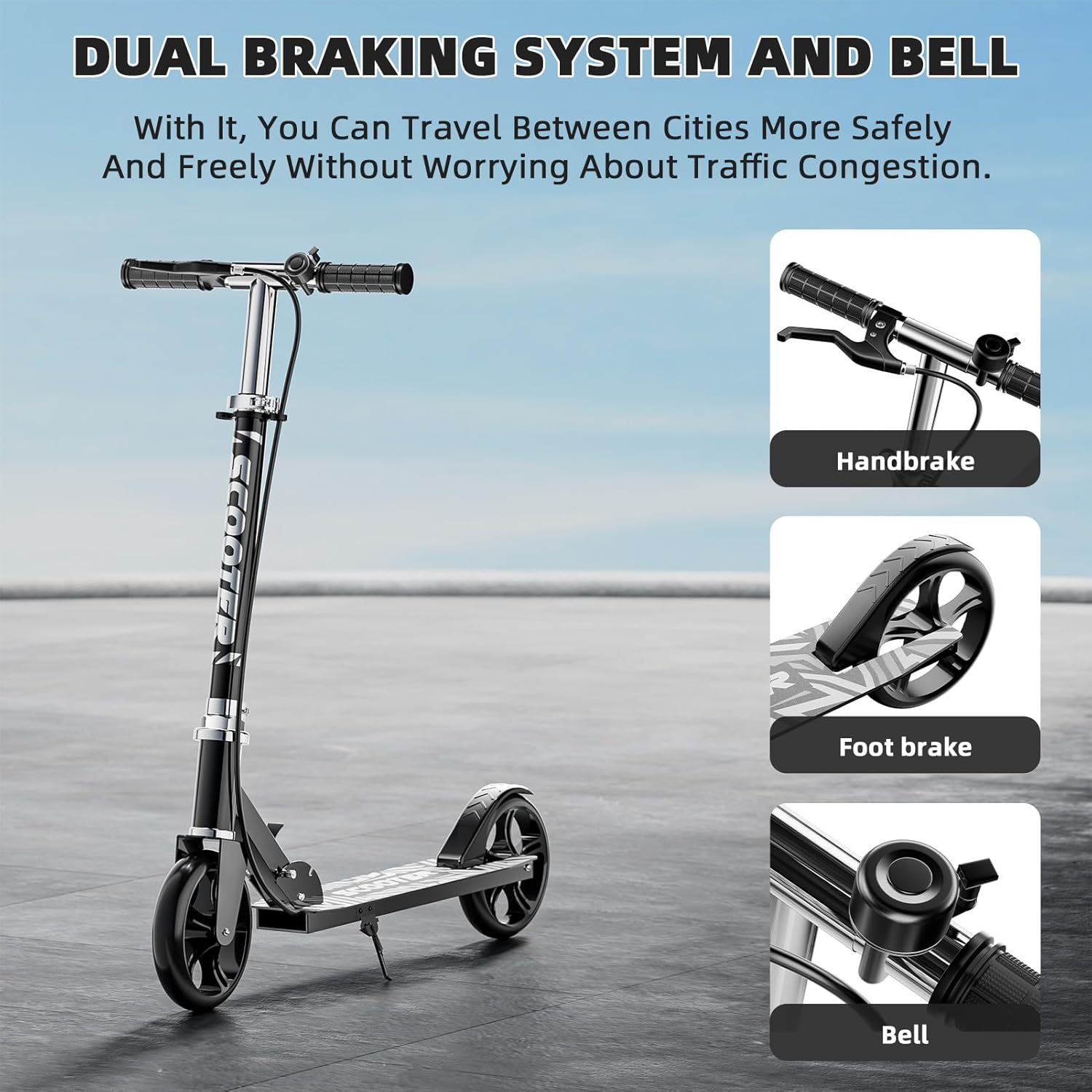 - Dual-Brake Safety System: Equipped with hand and foot brakes for enhanced control, plus a loud alert bell. Ensures reliable stopping power and visibility during rides, prioritizing safety on sidewalks or busy streets