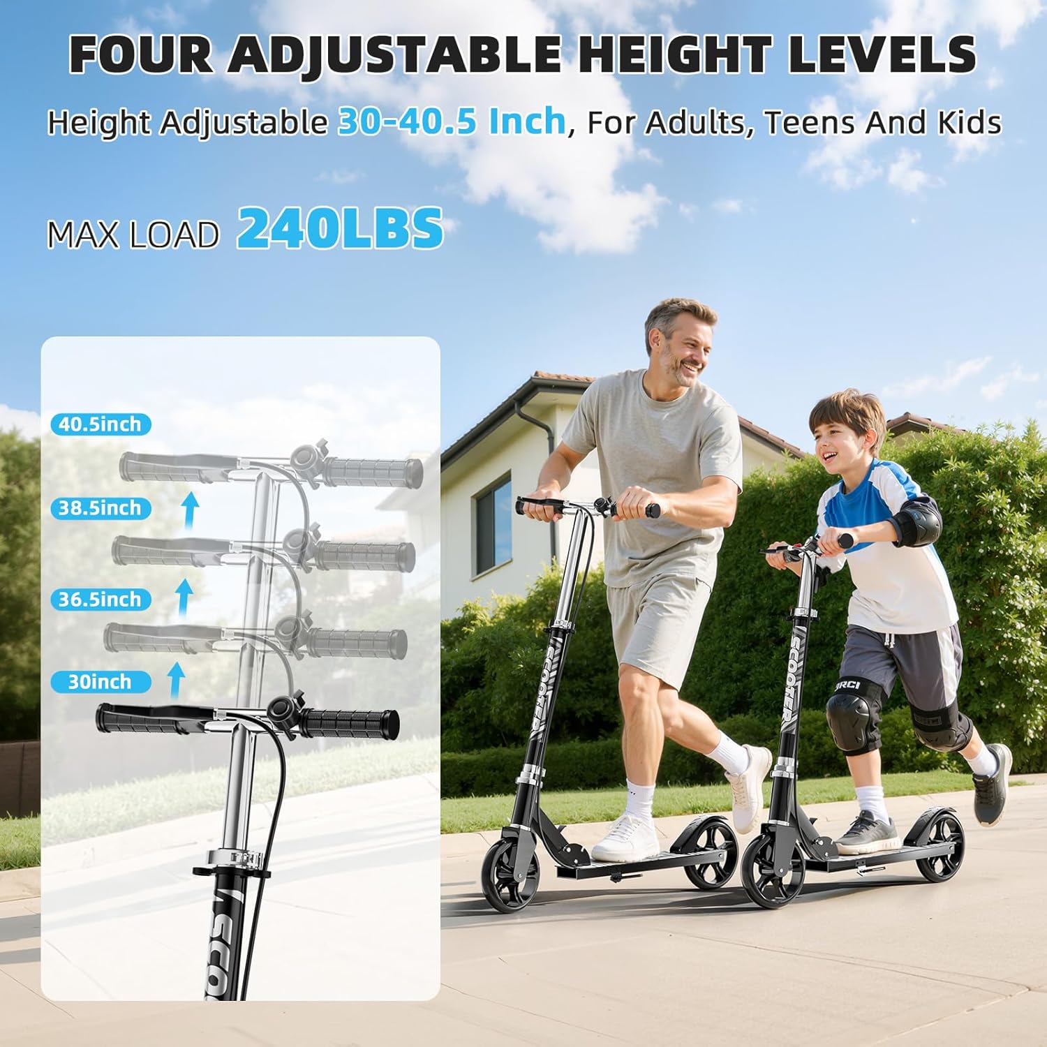 - Height Adjustable: Supports 3.9 FT – 6.6 FT height riders. The handlebar is adjustable to 4 height options (30”, 36.5”, 38.5”, 40.5”), The perfect family scooter, the same scooter can be used by parents and daughter and son riding together