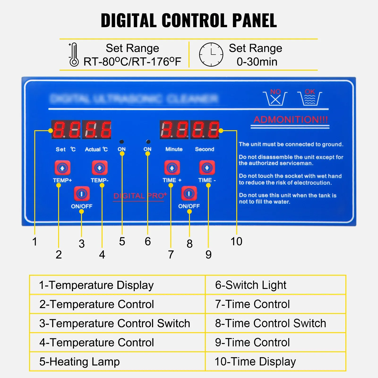 - 【DIGITAL CONTROL PANEL】 – The jewelry cleaner ultrasonic machine features a digital control panel, with an adjustable timer (0-30 min) and heater (RT-176℉/RT-80℃) displayed on LED. A heating function can effectively soften and dissolve oil and wax stains, thereby improving the cleaning effect.