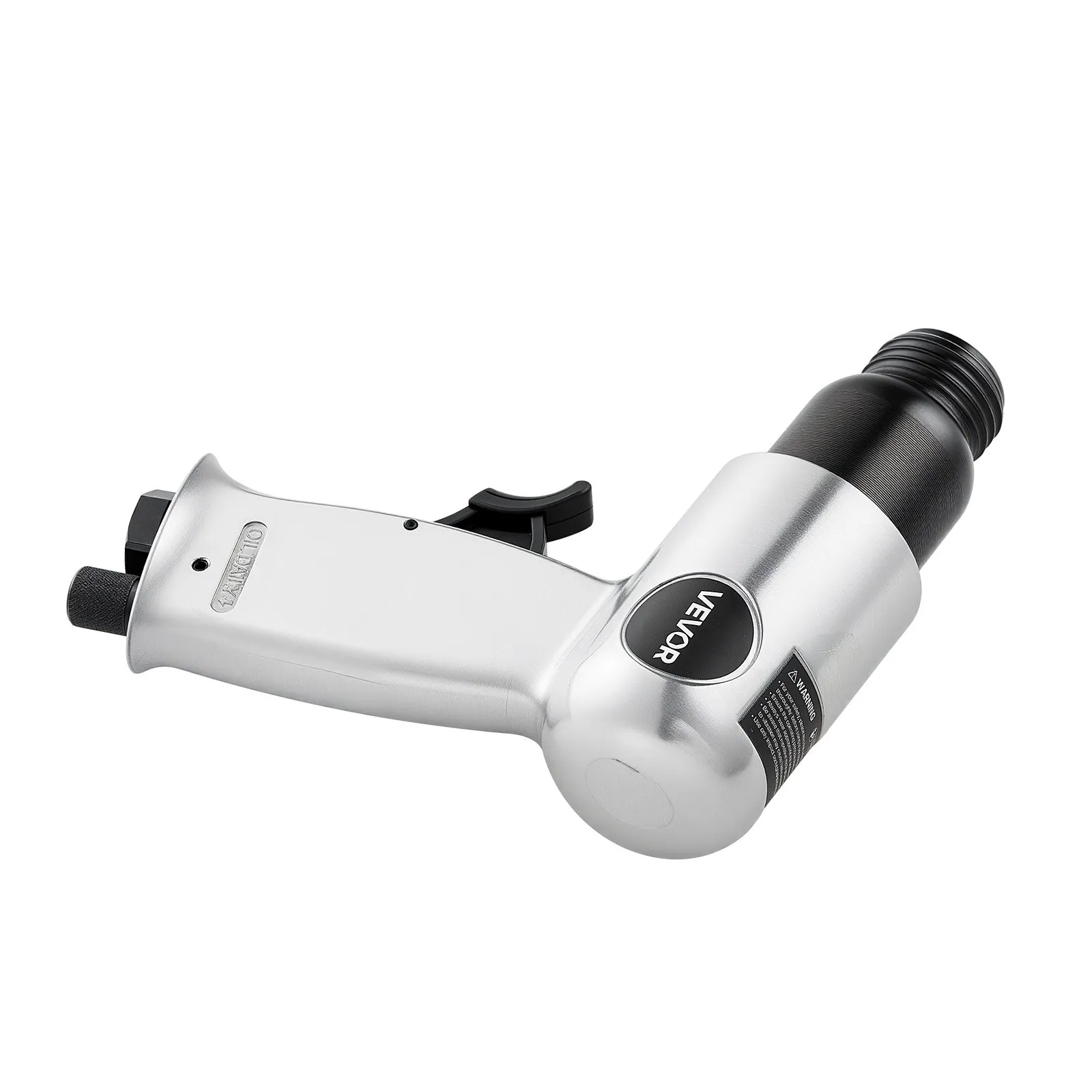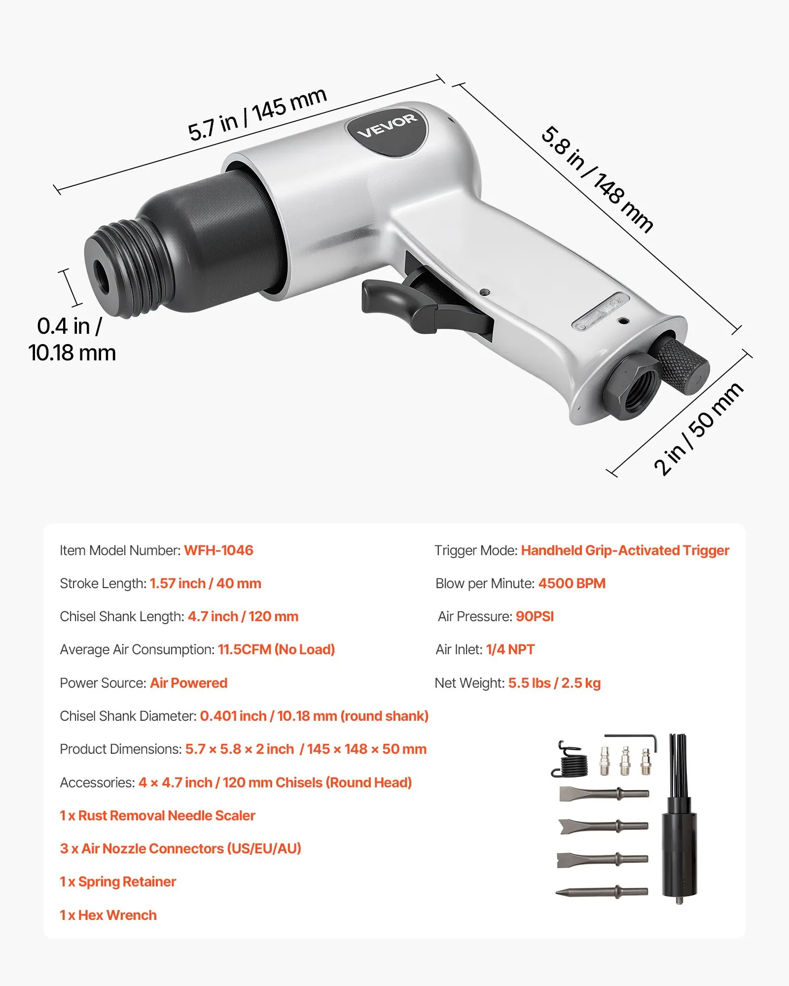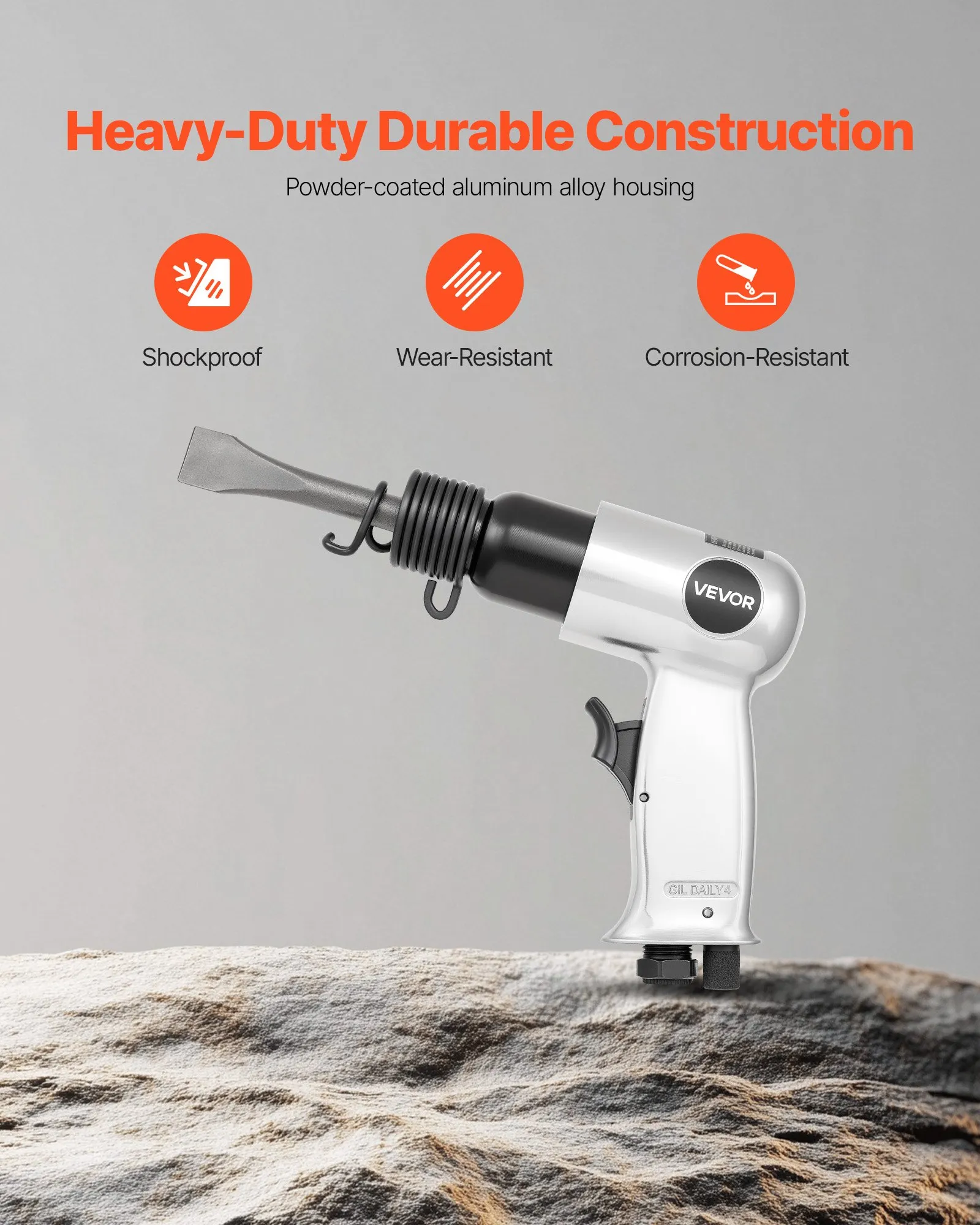 VEVOR air hammer delivers strong impact force with 4500 BPM high-frequency strikes and a 1.57 inch stroke, ideal for cutting metal, breaking concrete walls, chiseling floors, removing bolts. It features a rust removal air needle scaler, 4 chisels, one-button start function, and an ergonomic grip.