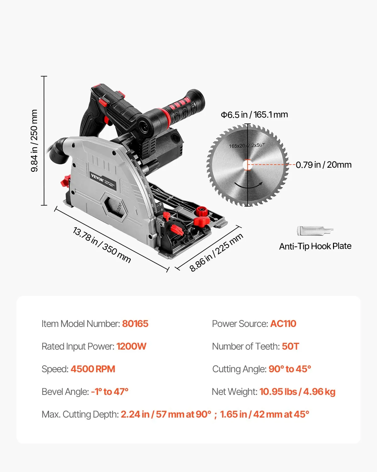 - Fast & Accurate Cutting: This plunge circular saw kit features a 6.5 in, 50-tooth carbide-tipped blade with a max vertical cutting depth of 2.24 in (57 mm) and a 45° bevel depth of 1.65 in (42 mm). You can tailor each cut to your project needs, enhancing the tool’s versatility