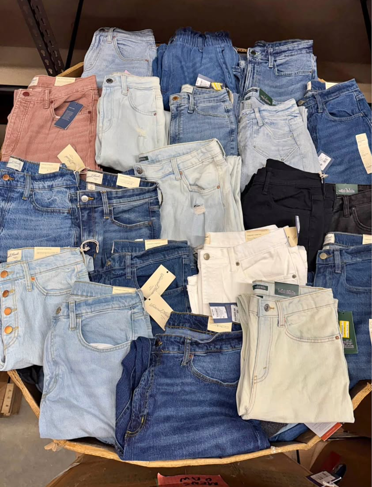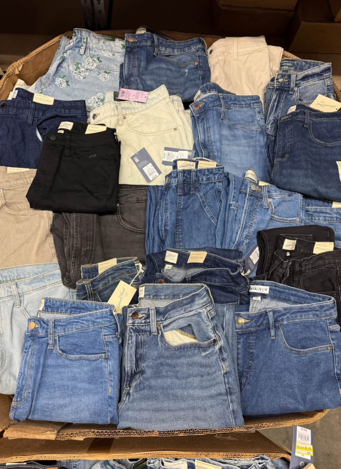 Pallets of women’s jeans from Target. Includes a variety of different styles and sizes (no higher than size 18). Brands included are Levi’s, Universal Thread, Wild Fable, Knox Rose, Future Collective, Ava & Viv, and more. 95% new with tags.